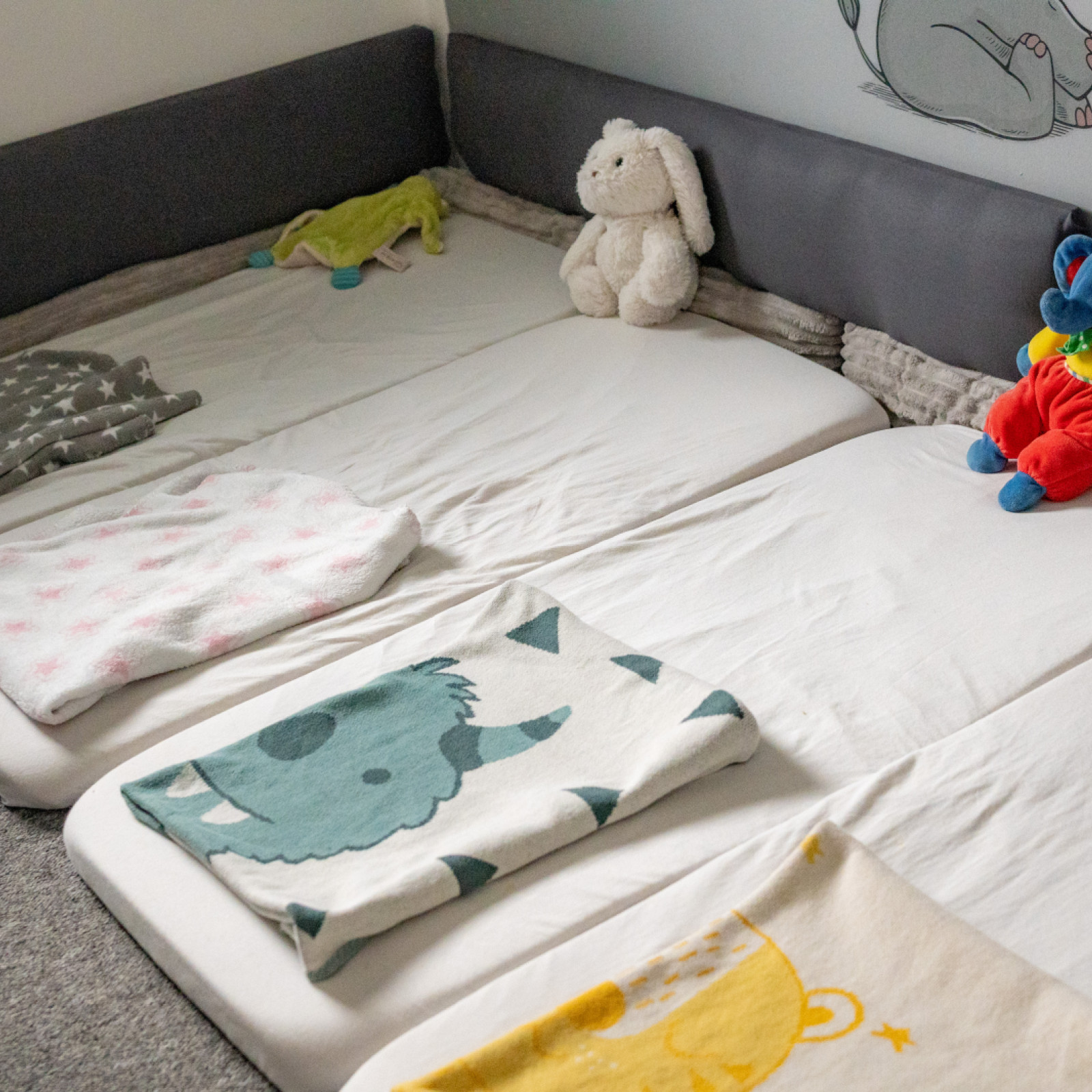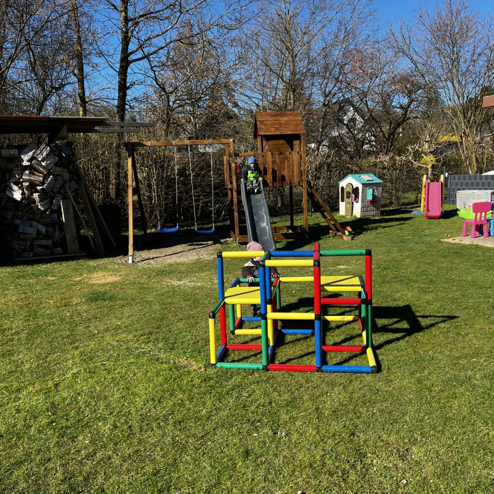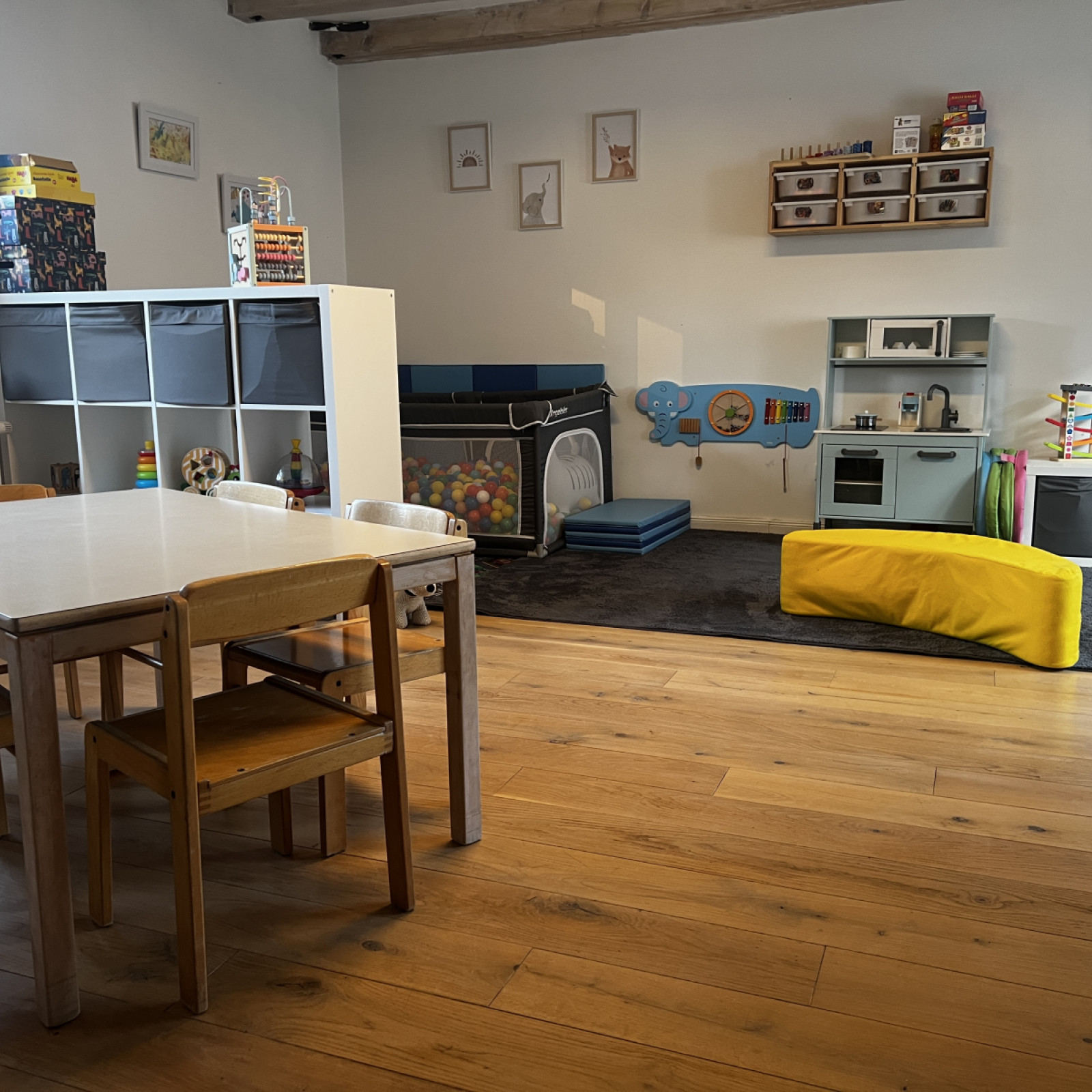 Für meine Kindertagespflege habe ich einen extra Raum, in dem es viel Platz zum Toben, Spielen und Entdecken gibt. Der Raum wurde mit viel Liebe eingerichtet. Ich habe darauf geachtet, dass alles in angemessener Höhe für die Kinder ist, was zum selbständigen Entdecken und Ausprobieren anregt. Es gibt ein Bällebad, wo nach Herzenslust getobt werden darf, eine Kinderküche, eine Bau-Ecke, eine Kuschelecke, Bücher, Musikinstrumente und vieles mehr. In unserem Gruppenraum steht auch ein Tisch, der sich auf Kinderhöhe befindet, wo wir unsere Mahlzeiten vorbereiten und zu uns nehmen oder auch mal basteln oder puzzeln können. In der Küche koche ich jeden Tag frisch, diese ist zur Sicherheit mit einem Türgitter abgesichert. Ein separater Schlafraum steht auch zur Verfügung, wo jedes Kind Platz zum ausruhen hat. In unserem Badezimmer gibt es für jedes Kind sein eigenes Handtuch und um zum Waschbecken zu gelangen, gibt es einen Tritthocker. Bei Bedarf steht eine Toilettentreppe oder ein Töpfchen für die Kinder zur Verfügung.